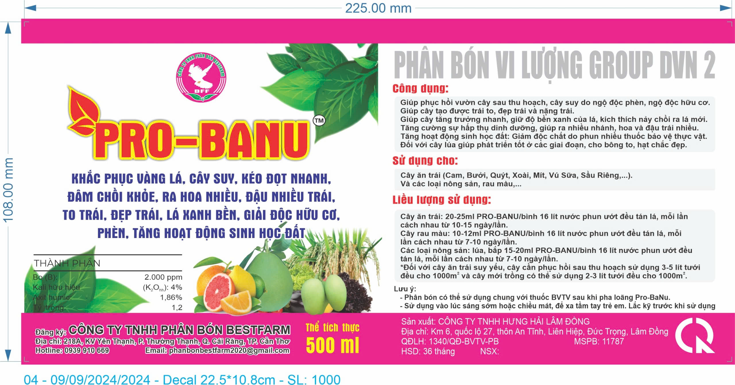 | Cây lúa, ngũ cốc | 15–20 ml Pro-Banu/bình 16L nước | 7–10 ngày/lần | Phun vào giai đoạn mạ con, đẻ nhánh và làm đòng |