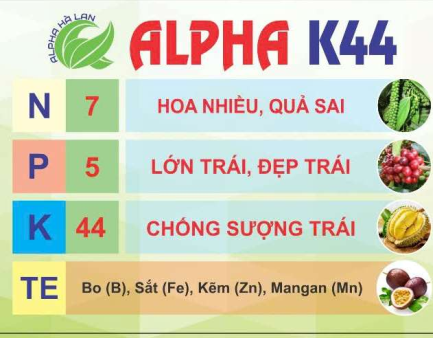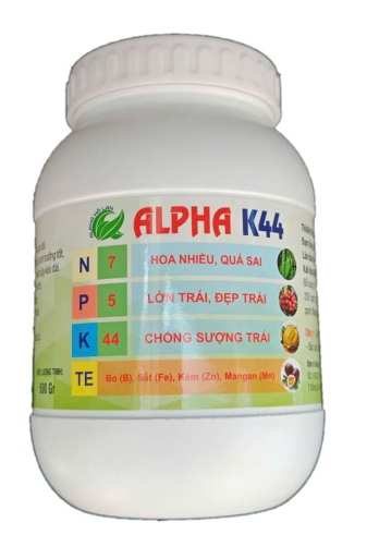 Phân bón lá ALPHA K44 siêu Kali, cung cấp NPK và các nguyên tố vi lượng giúp hoa nở nhiều, quả sai, trái lớn và đẹp, chống sượng trái.