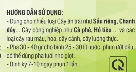- Pha 30-40 gram cho bình 25-30L nước, phun ướt đều, có thể dùng pha tưới nhỏ giọt.
