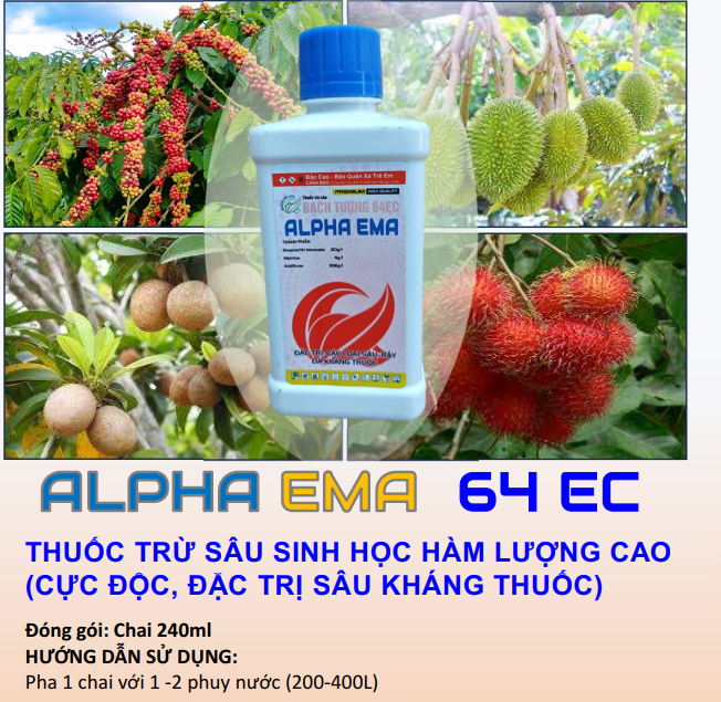 Thuốc trừ sâu ALPHA EMA 64EC có nguồn gốc sinh học, hàm lượng cao, cực độc. Côn trùng tiếp xúc với ALPHA EMA sẽ ngừng ăn và chết đói.