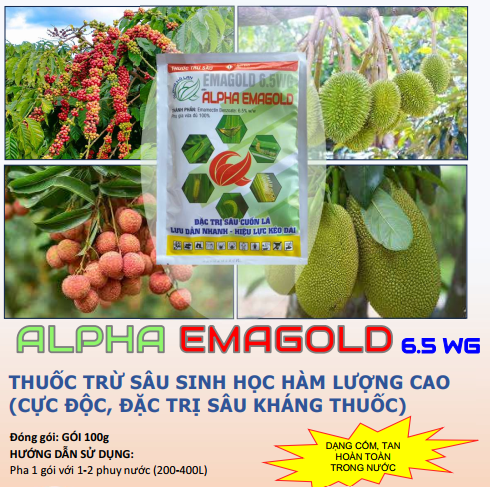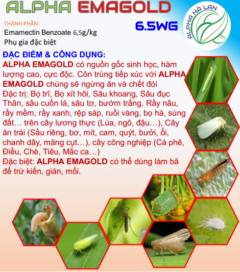 Thuốc trừ sâu ALPHA EMAGOLD 6.5WG có nguồn gốc sinh học, hàm lượng cao, cực độc. Côn trùng tiếp xúc với ALPHA EMA sẽ ngừng ăn và chết đói.